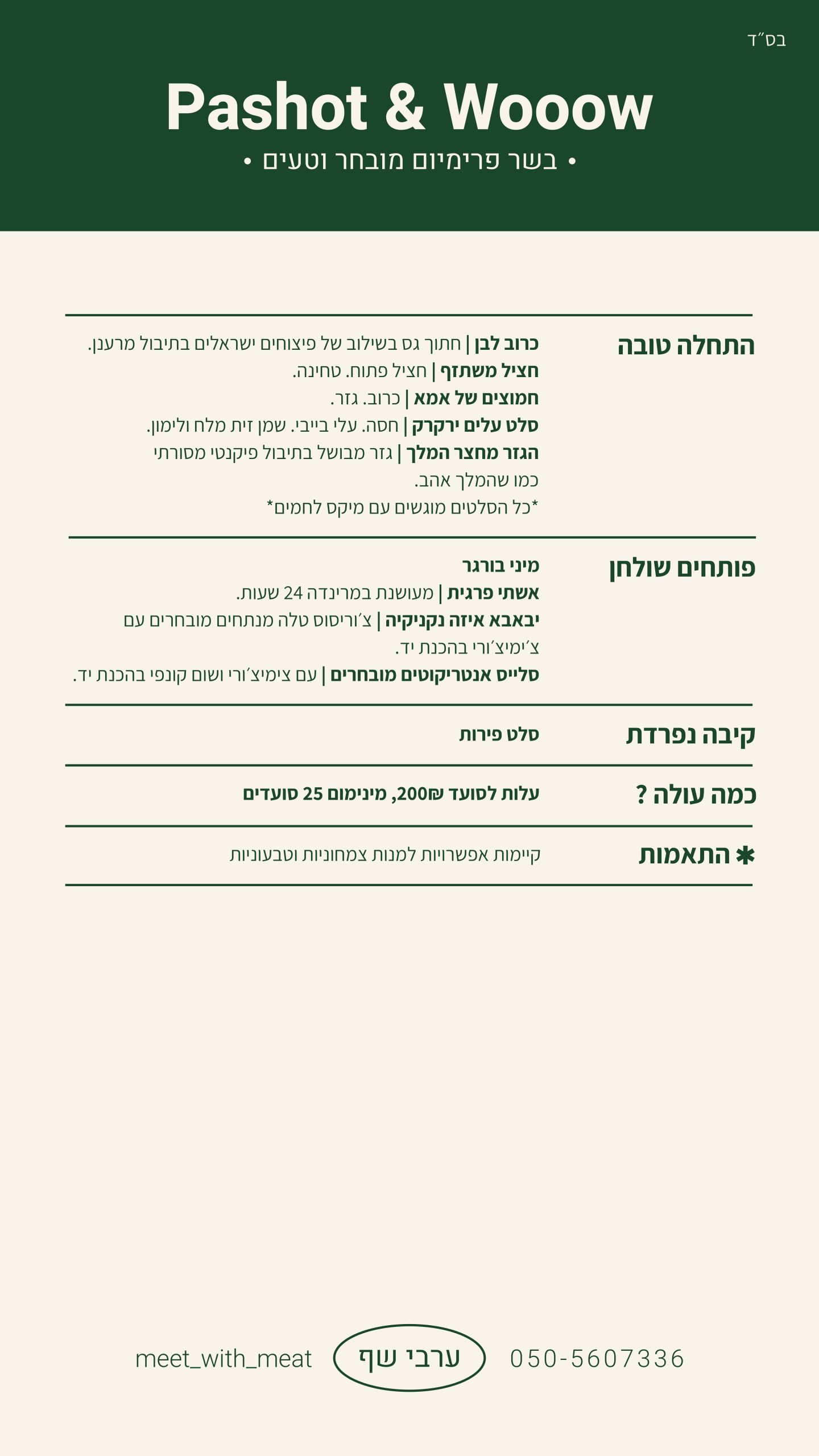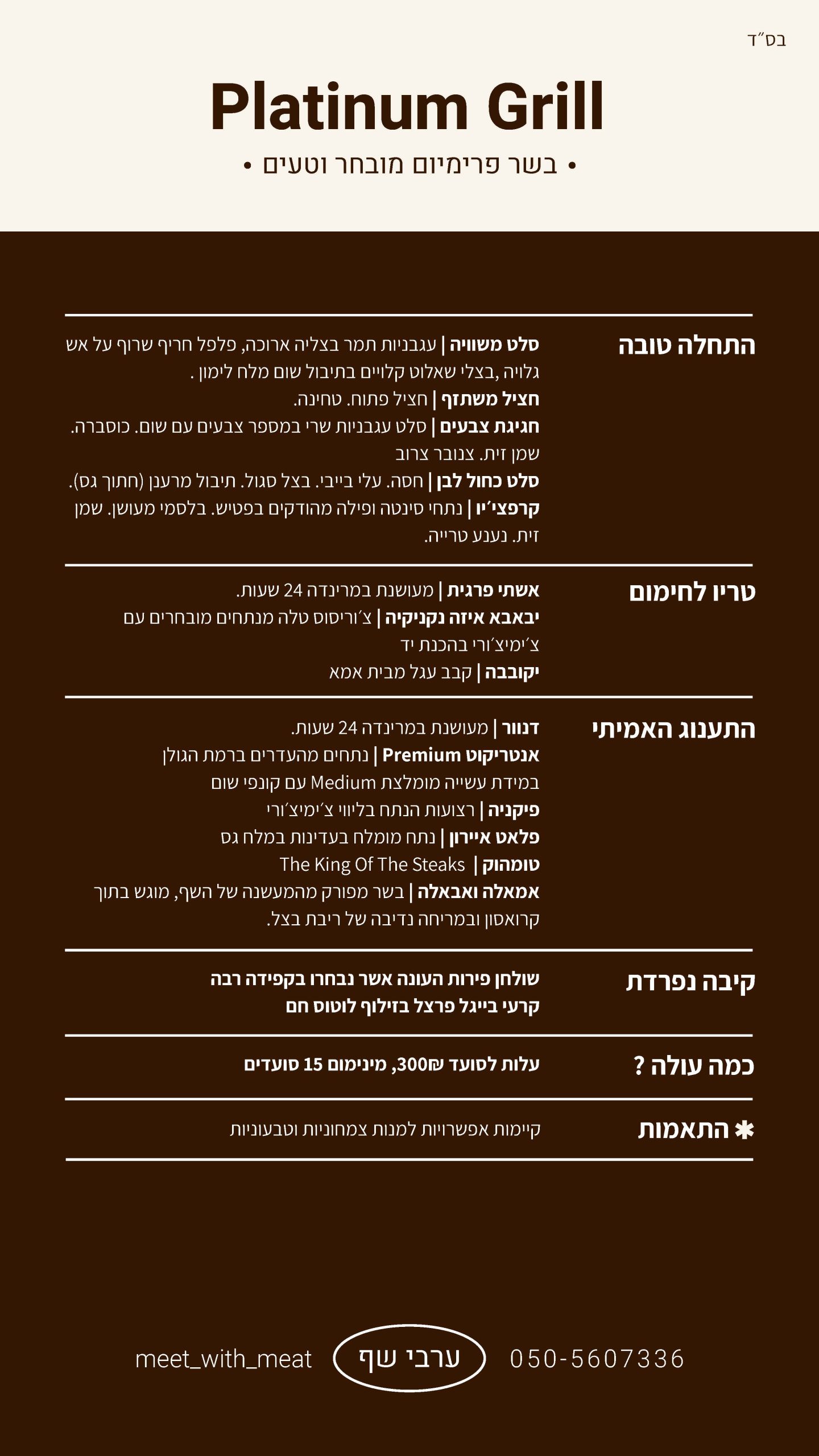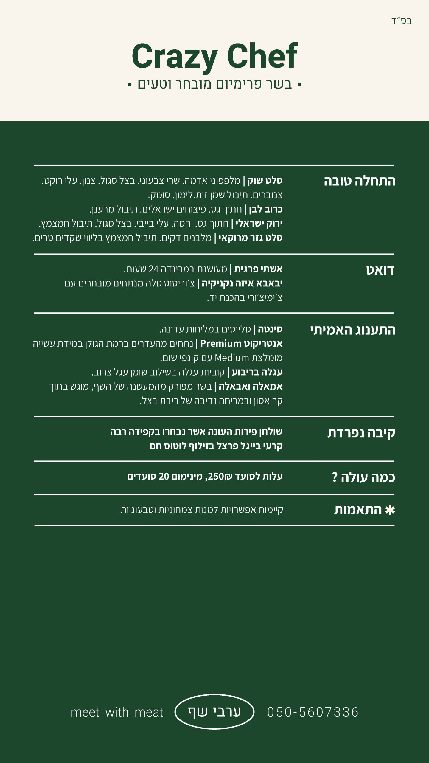 לא משנה אם אתם מתכננים אירוע משפחתי, מסיבת ערב או סתם ארוחה מושקעת – אנחנו מביאים את הבשר האיכותי ביותר, בגריל שהופך כל ביס לחוויה. עם כשרות מהודרת, כל נתח עובר טיפול אישי, בישול מקצועי ואהבה אמיתית לאוכל. בואו לגלות איך בשר כשר יכול להיות גם טעים, גם איכותי, וגם יוצא דופן. שף בשרים כשר שמתאים את עצמו בדיוק לאירוע שלכם – כי כל רגע ראוי להימנות עם הטעמים הכי טובים. כל הבשרים שלנו הם של המותג RARE 55.